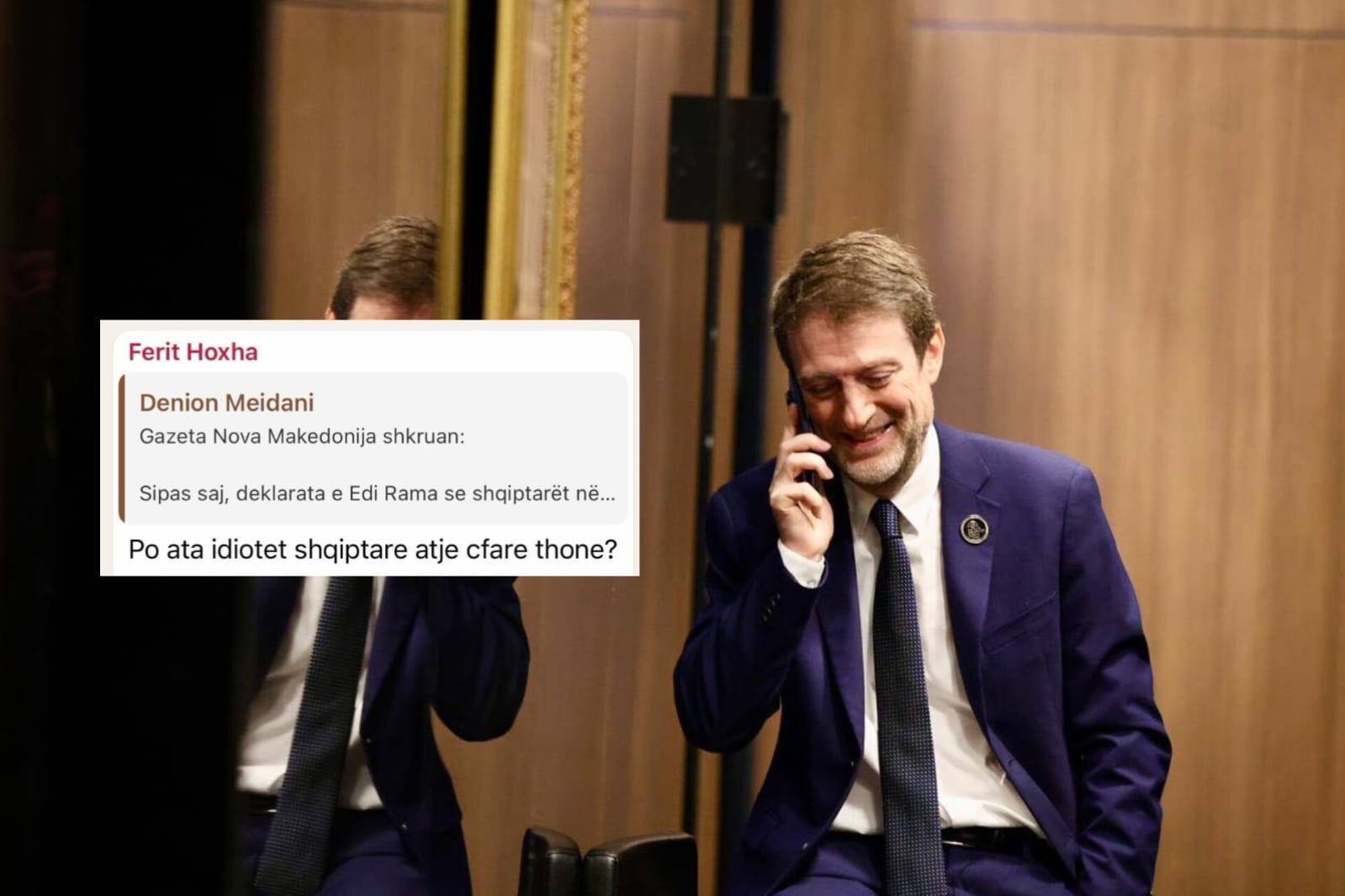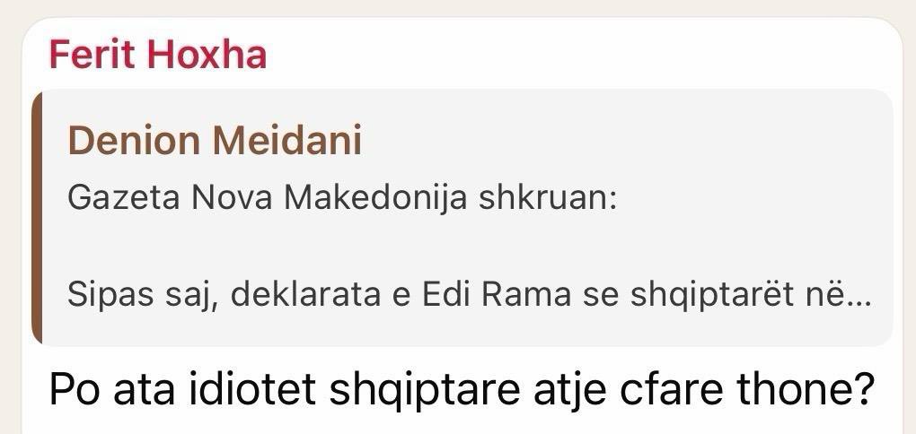 Një incident i rëndë diplomatik ka ndodhur ditën e sotme pas zbulimit të një mesazhi të ministrit për Evropën dhe Punët e Jashtme, Ferit Hoxha, ku ai i cilëson shqiptarët e Maqedonisë së Veriut si “idiotë” në një bisedë grupi. Pas reagimeve të shumta, Ministria e Jashtme e ka cilësuar fillimisht si të sajuar mesazhin, por opozita përmes deputetit Belind Këlliçi ka publikuar mesazhin që vërtetojnë ekzistencën e tij. Në mesazhin e fshirë më pas, Hoxha shkruante: “Po ata idiotët shqiptarë atje çfarë thonë?“.